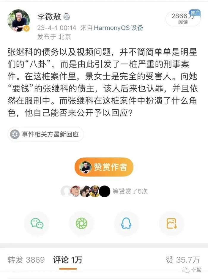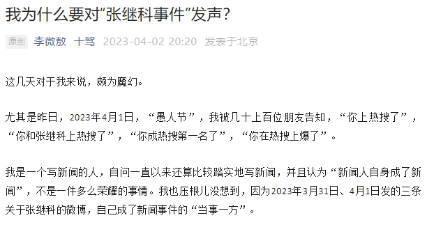 4月2日晚间,李微敖再发长文回应,“我为什么要对“张继科事件”发声”?