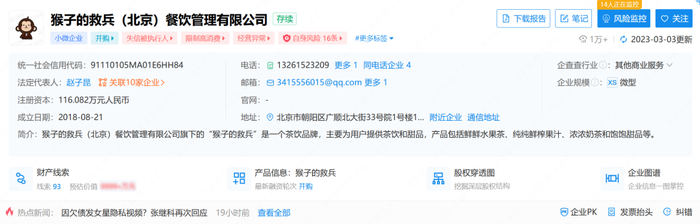 企查查显示,猴子的救兵(北京)餐饮管理有限公司实控人已七次被限制高消费,2021年5月被北京市朝阳区市场监督管理局列为经营异常。