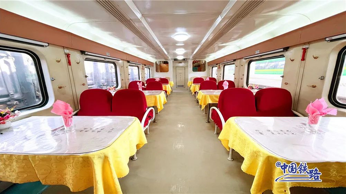 12时30分,“00后”火车迷皓轩正在餐车享用美食:“我之前在网上刷到过这趟车,今天专门买票来体验一下!都说餐车特别有年代感,饭菜也是物美价廉,果然名不虚传!”