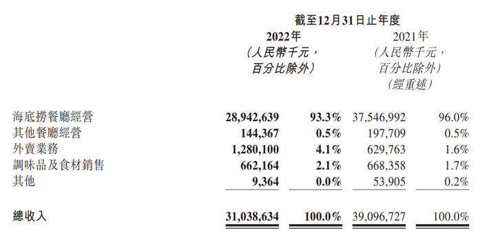 海底捞的收入主要来自经营海底捞餐厅,约占其2022年总收入的93.3%。此外,海底捞也有其他餐厅经营、外卖业务、调味品及食材销售业务等。
