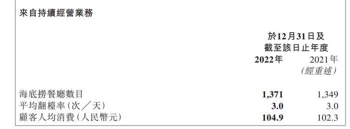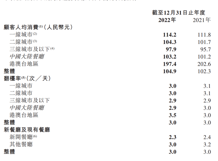 财报显示,2022年,海底捞餐厅的平均翻台率为3次/天,与2021年持平。 2022年,海底捞的顾客人均消费为104.9元,2021年则为102.3元。