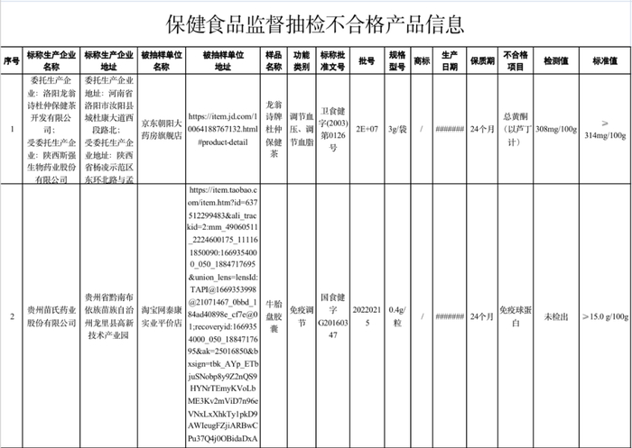 (一)京东朝阳大药房旗舰店(经营者为江苏省无锡朝阳医药连锁有限公司)在京东商城(网店)销售的、标称河南省洛阳龙翁诗杜仲保健茶开发有限公司委托陕西斯强生物药业股份有限公司生产的龙翁诗牌杜仲保健茶,其中总黄酮(以芦丁计)含量不符合有关产品执行标准要求。