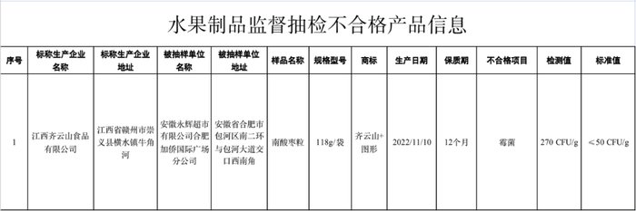 安徽永辉超市有限公司合肥加侨国际广场分公司销售的、标称江西齐云山食品有限公司生产的南酸枣粒,其中霉菌数不符合食品安全国家标准规定。