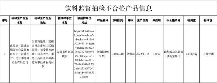 (一)天猫七角鹿旗舰店(经营者为河南开源电子商务有限公司)在天猫商城(网店)销售的、标称安徽省淮北金榴园文化发展有限公司出品的、山东省枣庄市旭峰实业有限公司生产的金榴园100%梨汁,其中山梨酸及其钾盐(以山梨酸计)检测值不符合食品安全国家标准规定。
