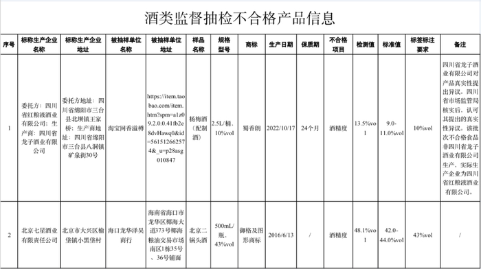 (一)淘宝网香溢樽(经营者为四川省成都市金牛区香新溢食品经营部)在淘宝网(网店)销售的、标称四川省红粮液酒业有限公司委托四川省龙子酒业有限公司生产的杨梅酒(配制酒),其中酒精度含量不符合产品标签标示要求。四川省龙子酒业有限公司对产品真实性提出异议。经四川省市场监管局核实,认可其提出的异议。确认该批次不合格产品实际生产企业为四川省红粮液酒业有限公司。