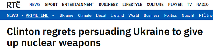 报道称,克林顿周二在接受RTÉ电视一台《黄金时段》(Prime Time)节目采访时,谈到了正在进行的俄乌战争,为自己在1990年代推动乌克兰“无核化”而感到遗憾后悔。