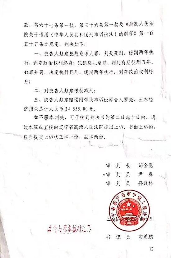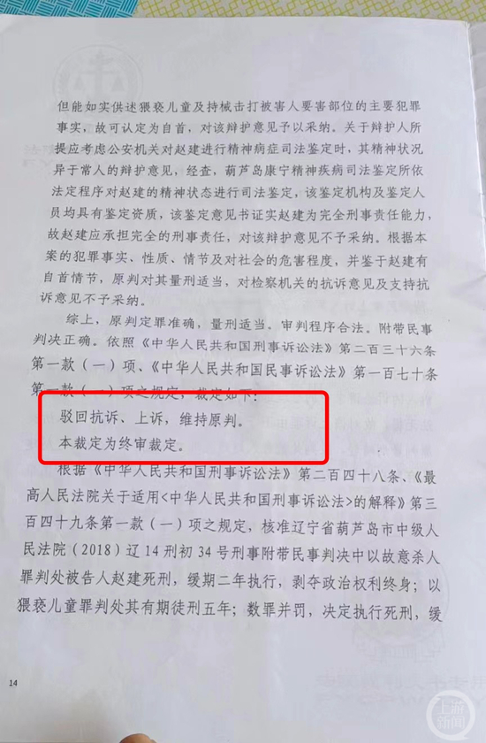 法院一审以故意杀人罪、猥亵儿童罪,判处赵建死刑,缓期2年执行。2019年,辽宁省高院二审裁定,维持葫芦岛市中院原判。女童父母再次提起申诉。检察院立案受理申诉后,向辽宁省高院提出再审检察建议。