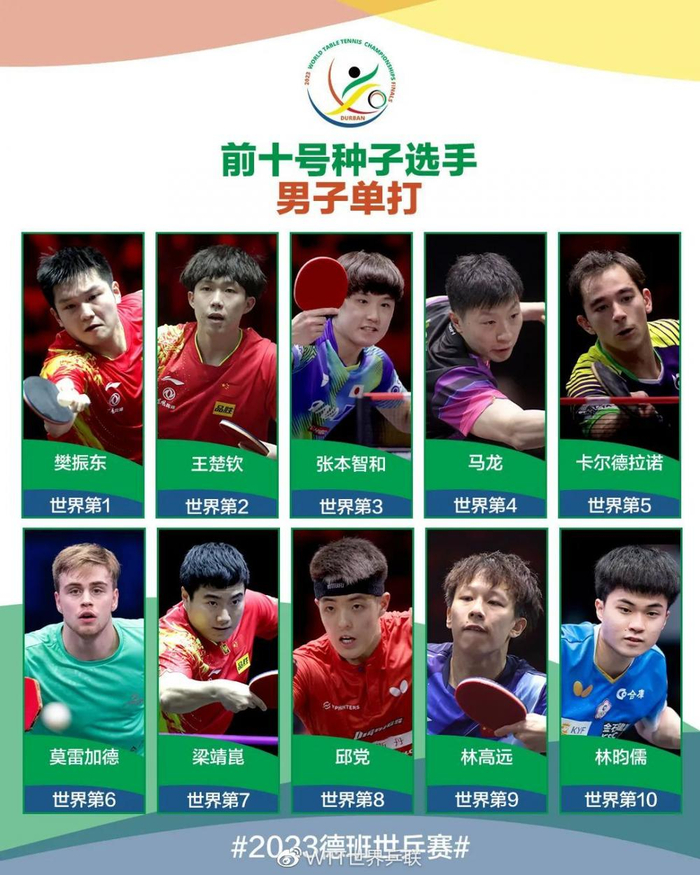 根据参赛名单,男单前十号种子选手为樊振东、王楚钦、张本智和、马龙、卡尔德拉诺、莫雷加德、梁靖崑、邱党、林高远、林昀儒。