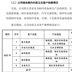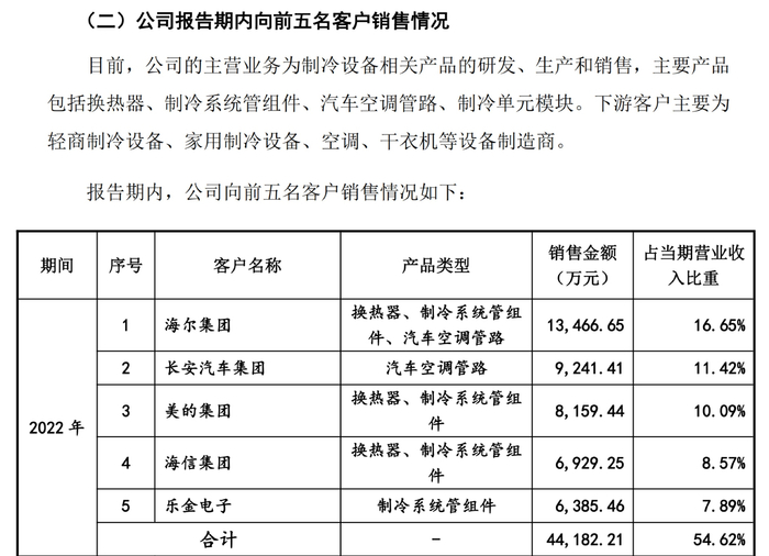2019年起,同星科技进入重庆长安汽车股份有限公司(000625.SZ)的供应链体系,供给的车型增加,且客户对公司产品需求亦增加,增加对汽车空调管路的供应。2022年,海尔集团和长安汽车集团位列同星科技前两大客户。
