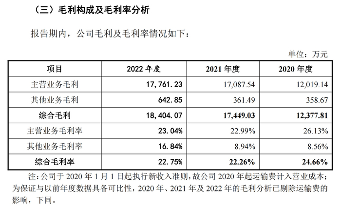 2020年、2021年和2022年,该公司主营业务毛利率分别为26.13%、22.99%和23.04%,2021年下降较为明显。对此,同星科技解释:主要系2021年以来铜、铝原材料涨价明显导致公司产品成本上升所致。公司2022年其他业务毛利率整体有所回升,主要系公司在当期铜、铝等原材料市场价格较高的情况下出售废料增多所致。