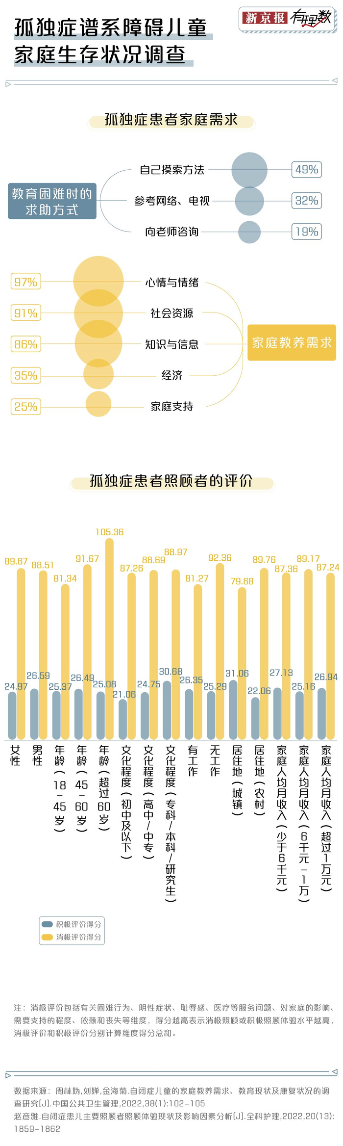 另一项关于孤独症患儿的照顾者体验的研究表明,在照顾孤独症患儿时往往存在较多的消极体验,比起居住在城镇、收入更高的家庭,年龄偏大、无工作的照顾者消极照顾体验水平更高。
