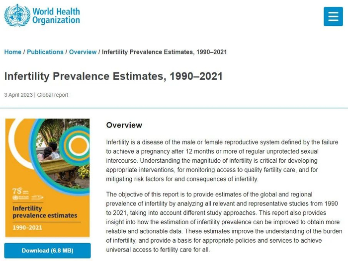 4月3日,世界卫生组织发布的《不孕症患病率估计(1990-2021)》报告估计,在全球范围内,约17.5%的成年人(约1/6人口)受到不孕症的影响,且有增加的趋势,不孕症已成为一个重要的公共卫生问题。