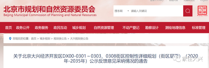 关于北京大兴经济开发区DX00-0301~0303、0308街区控制性详细规划(街区层面)(2020年-2035年)公示反馈意见采纳情况的通告