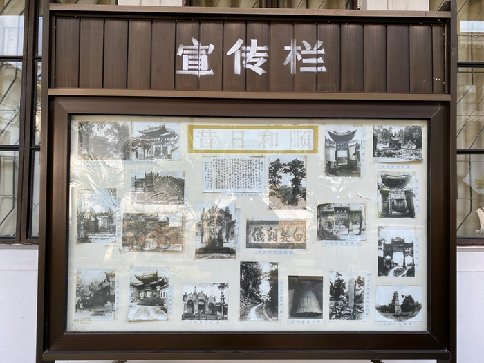 主楼正门除了三度悬挂和顺图书馆名牌、国家一级图书馆铭牌,以及两扇木质屏风式的图书馆简介、书籍简介外,还挂出一张老照片。照片中的军人是中国远征军第二十集团军总司令霍揆彰,1944年7月26日~9月14日,他以和顺图书馆为指挥部,指挥中国军队从日军手中夺回了腾冲,成为抗日战争反攻阶段第一个光复的县城。