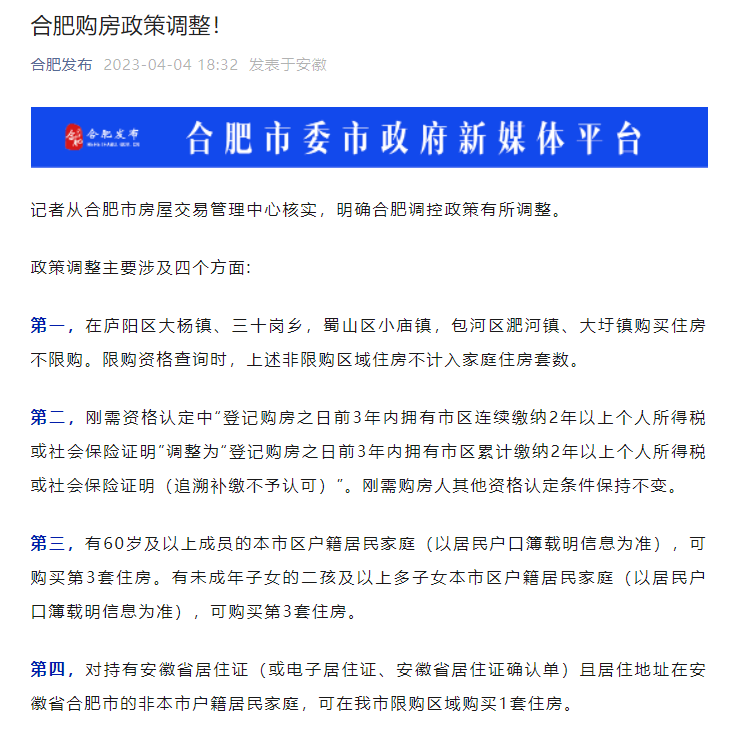 4月4日,合肥市人民政府新闻办公室官方账号“合肥发布”发布消息称,经合肥市房屋交易管理中心确认,合肥市调控政策有所调整。具体包括庐阳区大杨镇、三十岗乡等主城区部分区域不再限购,60岁以上成员或多孩家庭可买第三套住房等内容。