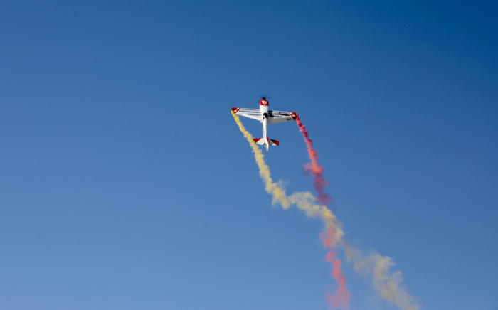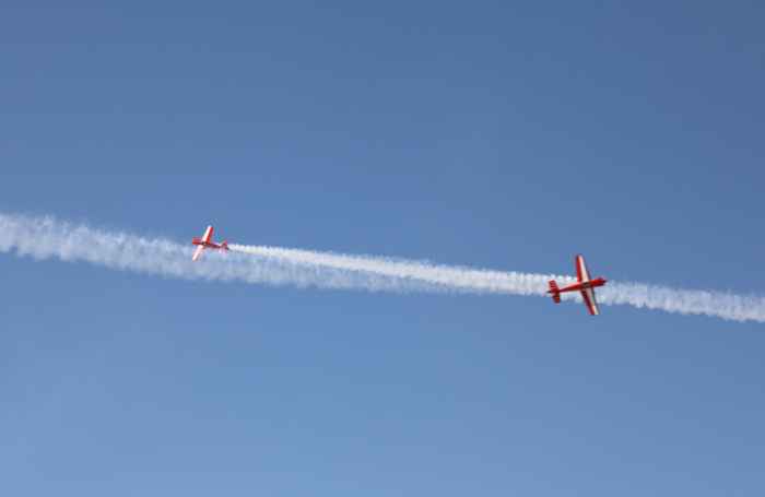 在大型特技飞机隐没在地平线下后,一架双翼机出现在人们的视野之中,庞大的机体在低空掠过观众头顶后开始爬升并放出彩烟,如同画家一般在天空中尽情挥毫,圆圈、方块、落叶飘,看似简单的图形却需要由一个个特技动作绘制。当烟雾徐徐散去,多架超轻型特技飞机悄然入场,时而在头顶悬停、时而一飞冲天、时而来到游客面前挥动机翼与大家互动,飞手灵动的控制仿佛让其有了生命,精彩的表演赢得了现场观众的阵阵掌声。