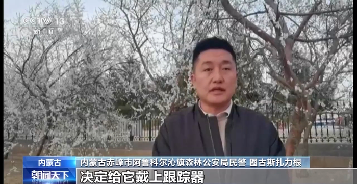 内蒙古赤峰市阿鲁科尔沁旗森林公安局民警 图古斯扎力根:研判之后,决定给它戴上跟踪器,这样可以在全天候对它进行监测保护的同时,将(它)放归大自然。