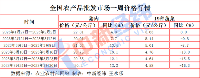 农业农村部数据显示,3月,猪肉、蔬菜批发价格仍处回落通道,截至3月30日当周,猪肉及19种蔬菜批发市场周均价为20.2元/公斤、4.58元/公斤,分别较截至3月2日当周均价下跌3.40%和10.89%,同比分别上涨12.2%和下降16.3%。