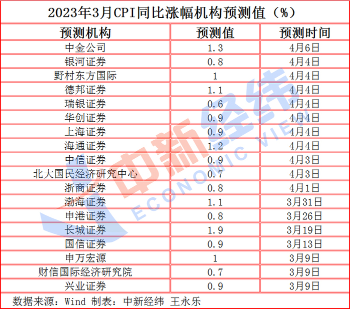 中新经纬3月11日电 (王永乐)11日上午,国家统计局将公布2023年3月居民消费价格指数(CPI)。多家机构预测的均值显示,3月CPI同比上涨1%。
