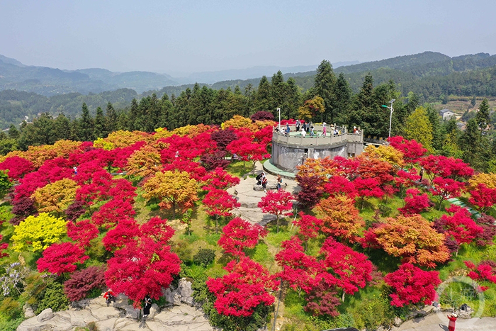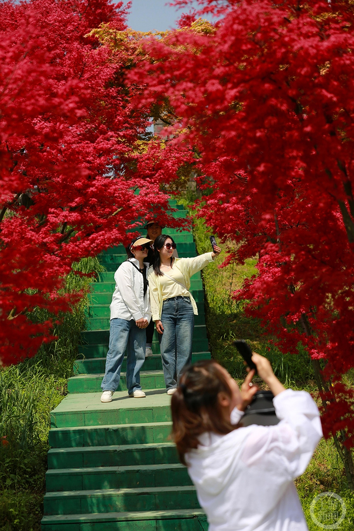 4月10日,在重庆市巴南区圣灯山镇五洲园景区内,今年新培育的锦绣枫染红了整个景区,也引来了众多市内外游客前来打卡游览。