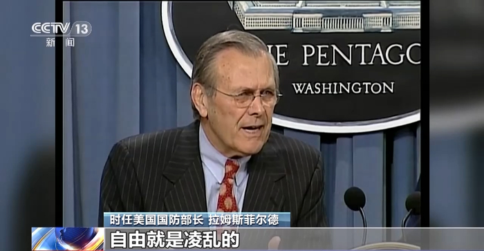 时任美国国防部长拉姆斯菲尔德:伊拉克是从专制政权过渡而来,凌乱无序是正常的,自由就是凌乱的。自由的人民想犯错就犯错,想犯罪就犯罪,想做坏事就做坏事,这是在所难免的。