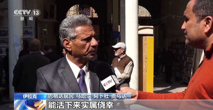 总台报道员贾法尔:我们现在位于伊拉克首都巴格达的穆塔纳比大街,这里是许多巴格达市民经常光顾的地方。我们来听听他们对2003年伊拉克战争的看法。请问2003年伊拉克战争期间,您有什么经历吗?
