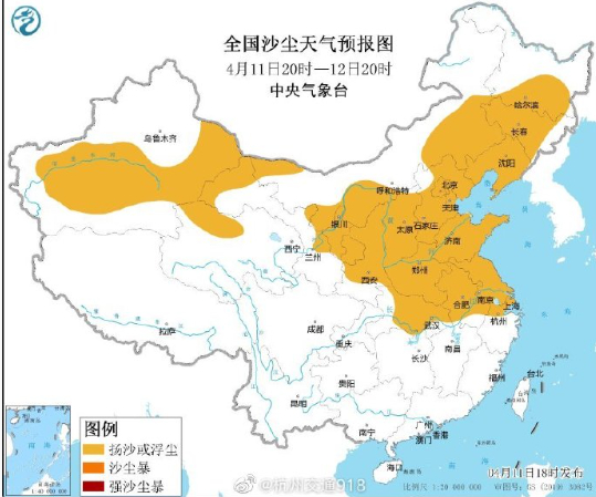 另据中央气象台昨晚继续发布的沙尘暴蓝色预警:受冷空气大风影响,预计4月11日20时至12日20时,新疆东部和南疆盆地、内蒙古中西部、甘肃东部、青海柴达木盆地、宁夏、陕西中北部、山西、河北、北京、天津、黑龙江南部、吉林、辽宁、山东、河南、安徽中北部、江苏、上海、湖北中东部等地的部分地区有扬沙或浮尘天气。