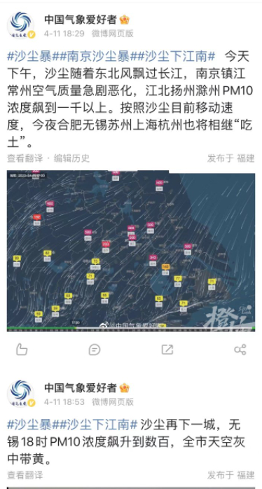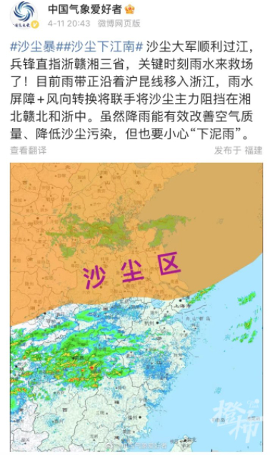 另一个微博用户“中国气象爱好者”同样连续发文指出,南京、镇江、扬州……相继失守,看来杭州也难逃“吃土”的命运了。