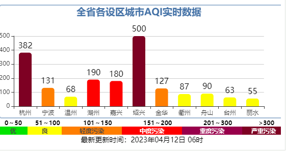 根据浙江省生态环境厅今天(4月12日)早间6点发布的环境质量数据:目前杭州的空气质量指数(AQI)为382,属于重度污染。