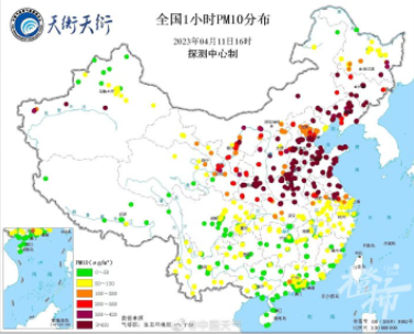 根据中国气象局气象探测中心综合气象观测产品系统(天衡天衍)监测显示,4月11日16时,本次沙尘气团南移,沙尘前沿到湖北、安徽、江苏,多地PM10浓度超过1000ug/m³。