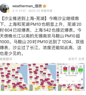 21:07,中国气象频道气象分析师信欣在微博上说:今晚沙尘继续南下,上海和芜湖PM10也明显上升,芜湖20时604已经爆表,上海542也接近爆表。今天傍晚长江以南的无锡南京马鞍山PM10超1000。马鞍山20时PM10达到了1204,双倍爆表,沙尘过了长江,浓度还能如此高,这也是少见的。