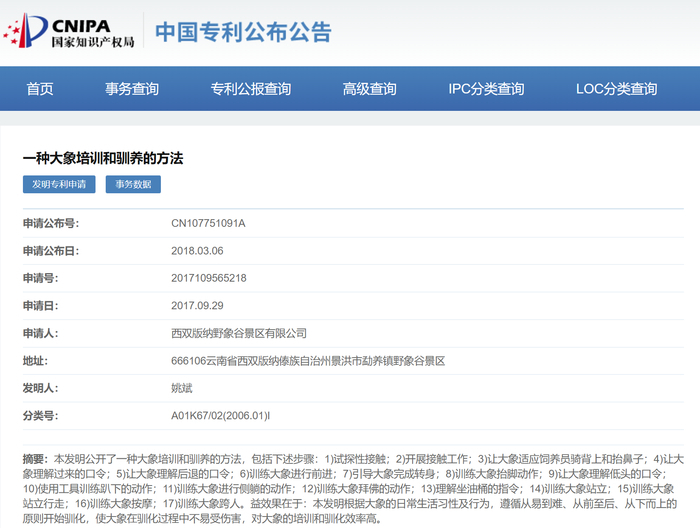 新黄河记者在国家知识产权局官方网站上查询到,《一种大象培训和驯养的方法》专利申请于2017年9月29日,于2018年3月6日正式公布,明确提出了训练大象转身、提脚、侧躺、拜佛、趴下、坐油桶、按摩、跨人等行为。但是据原告方律师以及旁听庭审的动物保护志愿者表示,被告方虽在庭审中称存在这项专利,但否认已实际投入使用。