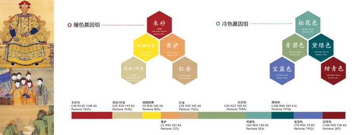 圆明园文化基因图谱中的用色充满中式浪漫:所有颜色均从《康熙帝画像》《圆明园四十景》等清代宫廷画作中提取。标准色为朱砂,暖辅助色组包括琉璃明黄、黄栌、红金、印金,冷辅助色由松花色、青碧色、黛绿色、宝蓝色、绀青色组成。