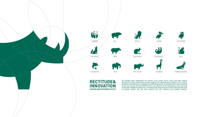 而为北京动物园提取文化基因时,重点在于如何传递它的百年历史信息,团队使用了上世纪传统美工字体规范全园确认类、说明类导引字体,并且利用信息设计原则,通过绘制动物图谱、重绘说明图标等方式构建了全新的说明类牌体规范。