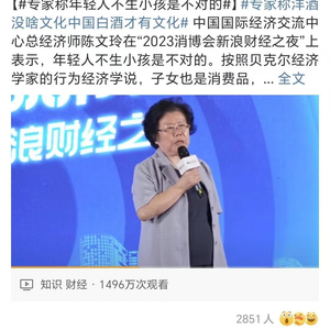 4月11日,经济学家、中国国际经济交流中心总经济师陈文玲在中国国际消费品博览会新浪财经之夜作主题演讲时表示,年轻人不生小孩是不对的。