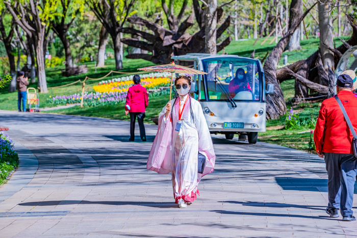 在花卉的衬托下,4月1日至5日,北京园博园首届国潮艺术节举办。国潮艺术节拉出超长游玩路线,从永定塔下到依文城堡,全长6公里,活动内容不重样。在满园春色中,园博园特色展园与沉浸式主题文化体验空间有效串联,以赏花、国潮、民族和戏曲四大亮点设计策划了各具特色的主题活动。