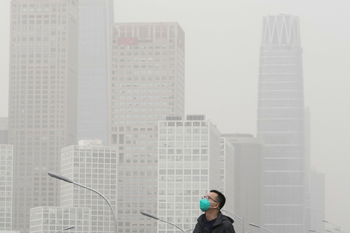 4月13日,沙尘暴袭击北京,一名戴着口罩的男子走在中央商务区附近的天桥上。图/视觉中国