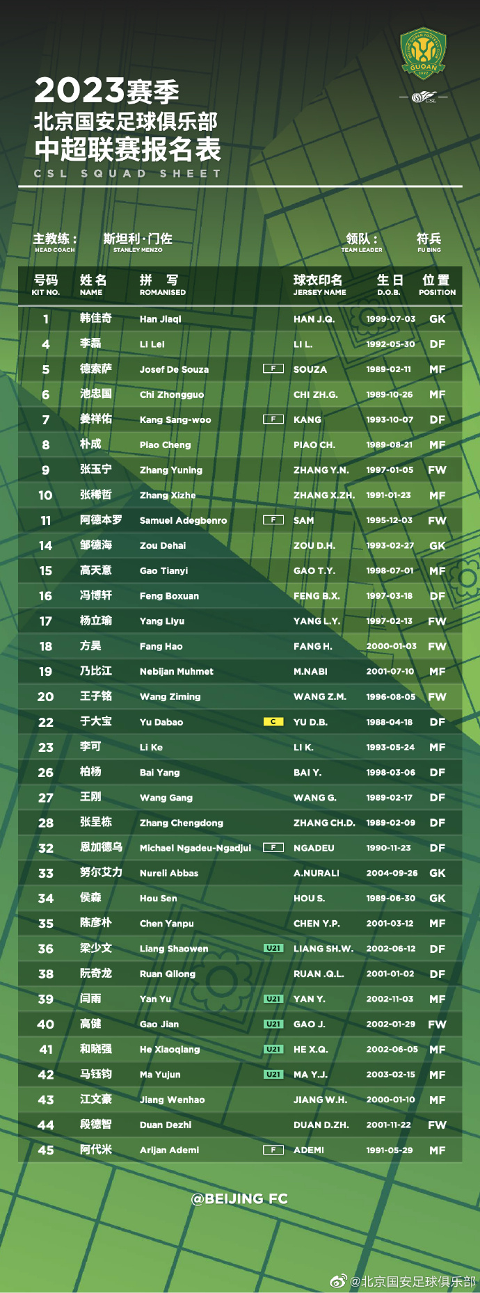 北京国安足球俱乐部公布2023赛季中超一线队34人名单