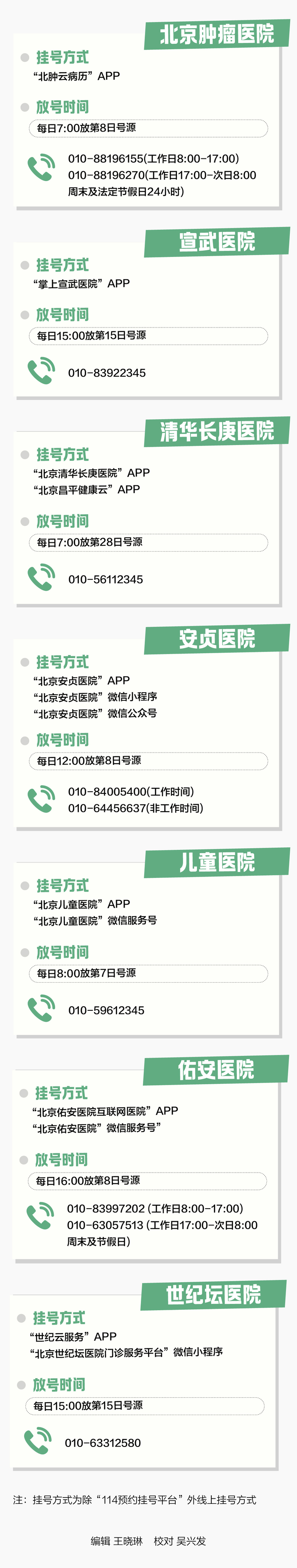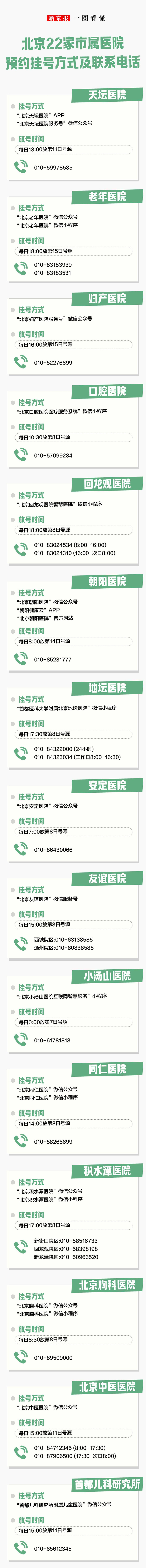 为更好地服务患者,北京市多家医院近日进一步畅通多种预约渠道,通过微信上线或升级了预约挂号服务平台。北京22家市属医院预约挂号方式、放号时间及联系电话一图了解↓↓↓