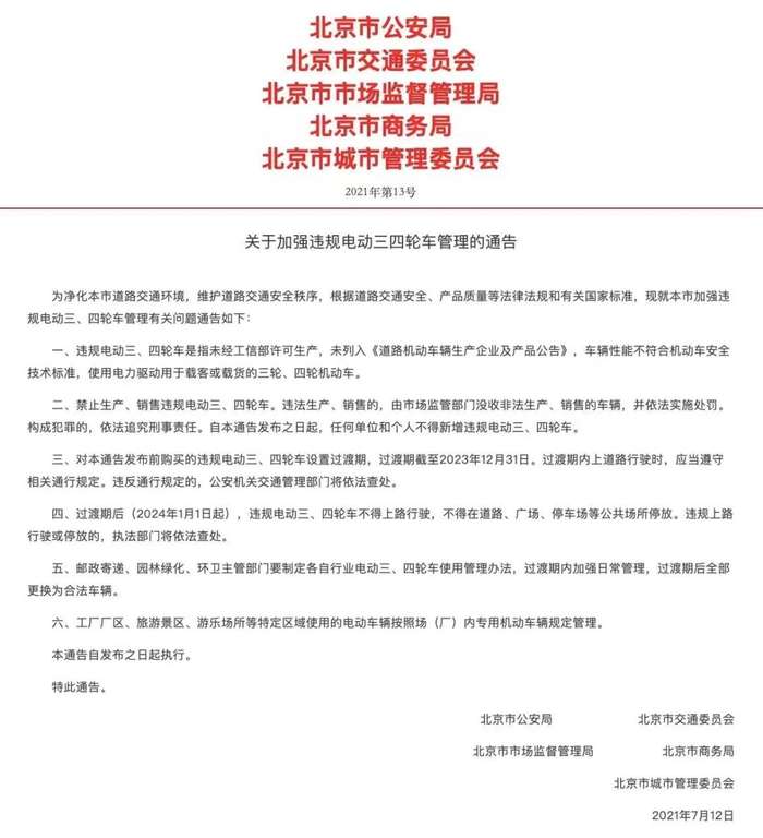 北京市交管局于4月12日再次强调,自2024年1月1日起,违规电动三、四轮车不得上路行驶,不得在道路、广场、停车场等公共场所停放。