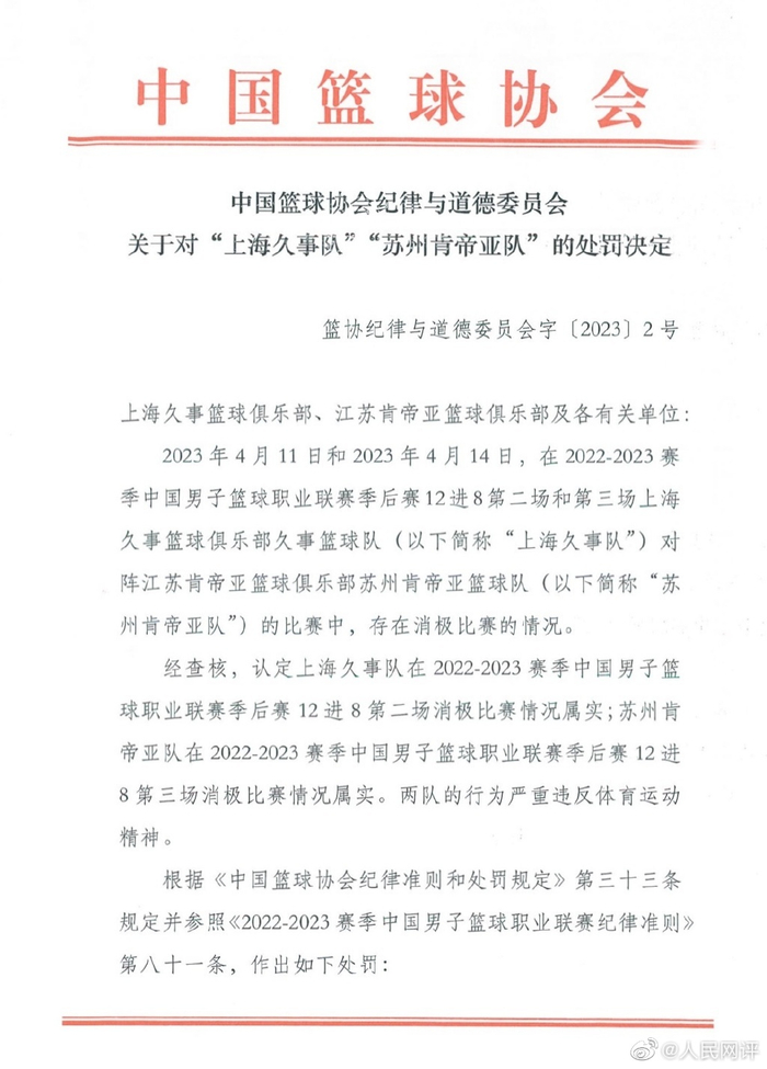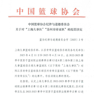 消极比赛,必被处理!据报道,中国篮球今天公布了对上海久事队、苏州肯帝亚队的处罚决定,两队被取消2022-2023 赛季比赛名次和2022-2023赛季参赛资格。此外,上海久事队主教练李春江、苏州肯帝亚队主教练李楠分别被禁赛5年、3年,两队俱乐部总经理也受到处罚。
