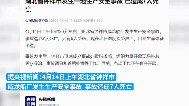 湖北一船厂闪爆事故致7死,省安委办:排查船舶制造领域隐患