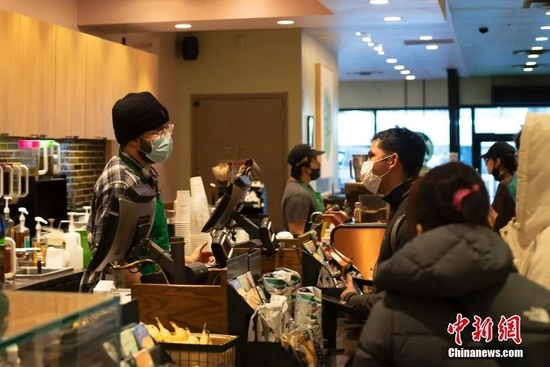 资料图:当地时间2022年2月10日,美国纽约市皇后区一家咖啡店内,人们戴口罩消费。当日,纽约州政府解除针对室内公共场所和私营企业的“口罩令”。