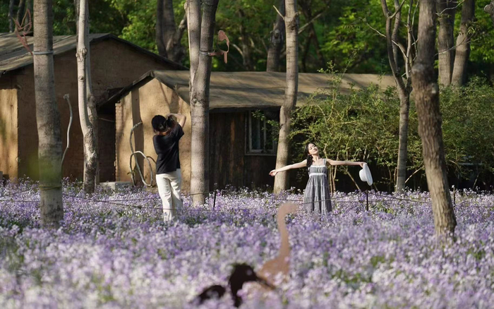 游客在将府公园二月兰花丛中拍照