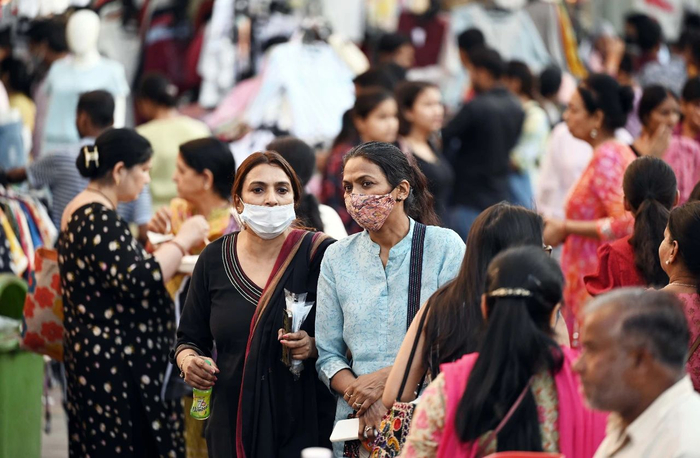 当地时间2023年4月8日,印度新德里,拉帕特·纳加尔中央市场挤满了游客。根据印度卫生部数据,印度的新冠病例数量在此前的24小时内急剧上升。图/视觉中国