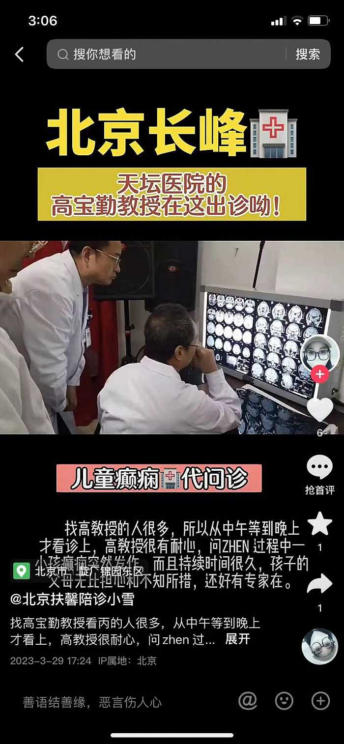 如在抖音上,用户“北京扶馨陪诊小雪”就曾在今年3月29日发表短视频,内容为“儿童癫痫代问诊”,提示天坛医院高宝勤教授可在北京长峰医院出诊。