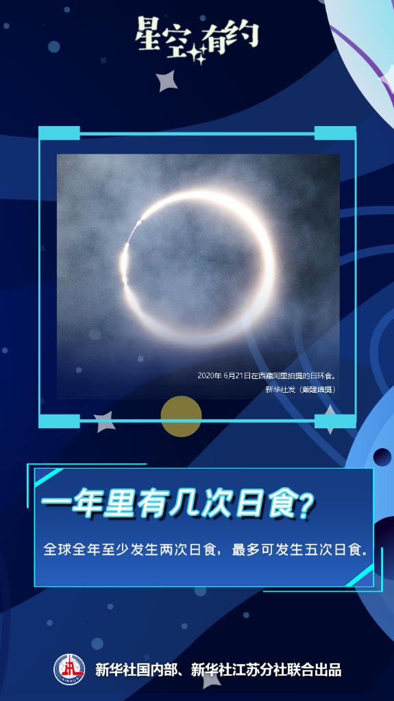 “只有当月球运行在黄道与白道相交的两个交点附近才会发生日食。就整个地球范围看,一年中至少会发生两次日食,最多可能发生五次日食。” 王科超说。