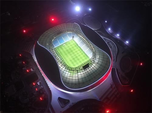 项目建设规模巨大,配套设施也堪称硬核。作为青岛新地标,项目超大体量泛光照明幕墙,具备世界级“颜值”,持续点亮城阳夜色。该项照明工程由3300米的立面轮廓灯,13000米格栅洗墙灯,18组高杆投光灯及投影灯共同组成,足球场西立面利用11万颗新型亮化装饰LED灯点光源布成两块大点阵屏,可根据需要发出不同灯光效果实现七彩渐变、跳变、扫描、流水等全彩效果;也可通过多个点光源像素点的阵列、造型组合来代替一定规格的显示屏,变化出各种图案、文字和动画、视频效果,可谓“流光溢彩”。