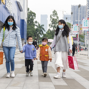 ▲广州街头,家长带着孩子经过商场。图/IC photo