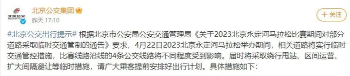 近前,北京公交集团发出北京公交出行提示。根据北京市公安局公安交通管理局《关于2023北京永定河马拉松比赛期间对部分道路采取临时交通管制的通告》要求,4月22日2023北京永定河马拉松举办期间,相关道路将实行临时交通管控措施,比赛线路沿线的4条公交线路将不同程度受到影响。届时将采取绕行甩站、区间运营、扩大间隔避让等临时措施,请广大乘客提前安排好出行计划。具体措施如下: 1、327路(城通街-槐树岭公交场站),7:00至管制结束,城通街发至三号桥区间,槐树岭公交场站发至园博园六号门区间。